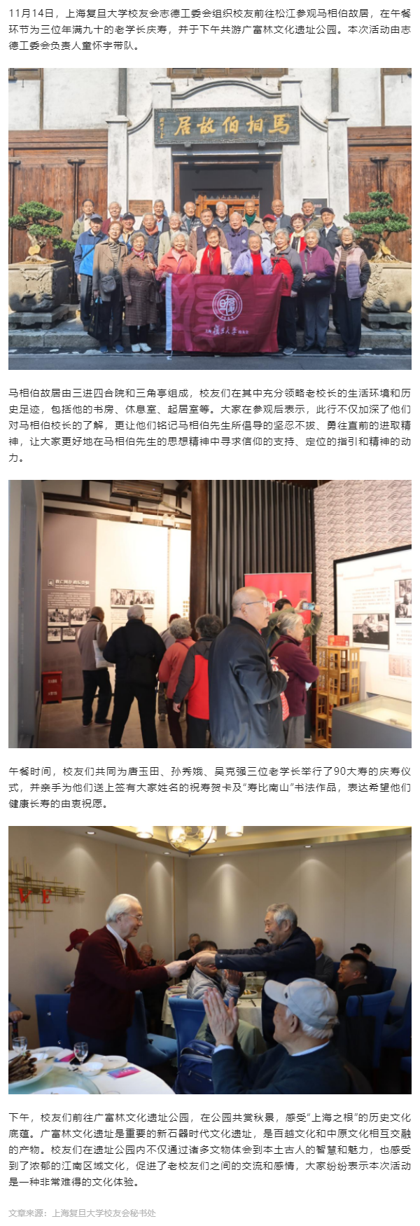 摘要:11月14日,上海复旦大学校友会志德工委会组织校友前往松江参观马相伯故居,在午餐环节为三位年满九十的老学长庆寿,并于下午共游广富林文化遗址公园。本次活动由志德工委会负责人童怀宇带队。