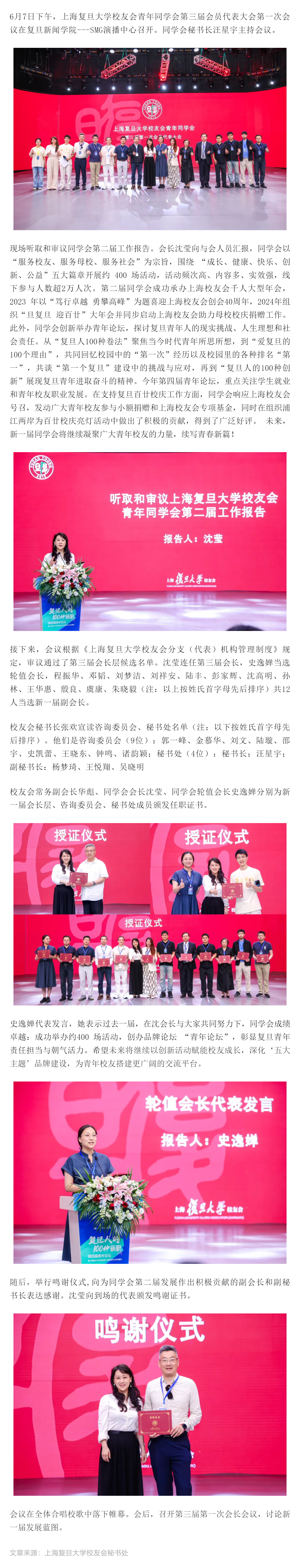 6月7日下午,上海复旦大学校友会青年同学会第三届会员代表大会第一次会议在复旦新闻学院---SMG演播中心召开