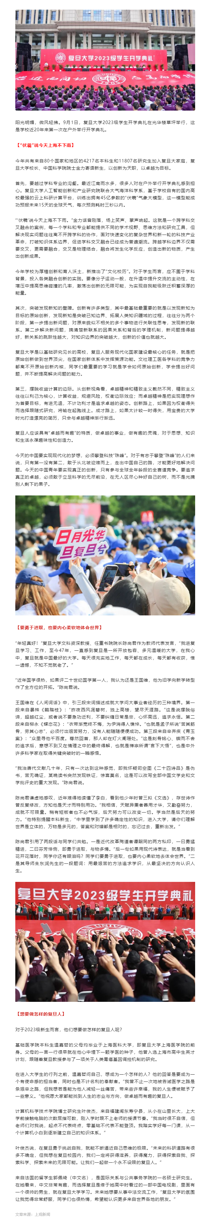复旦校长金力寄语新生:摆脱收益计算的边际,做卓越的事业,做有趣的灵魂 2023.09.01 摘要:阳光明媚,微风轻拂。9月1日,复旦大学2023级学生开学典礼在光华楼草坪举行,这是学校近20年来第一次在户外举行开学典礼。