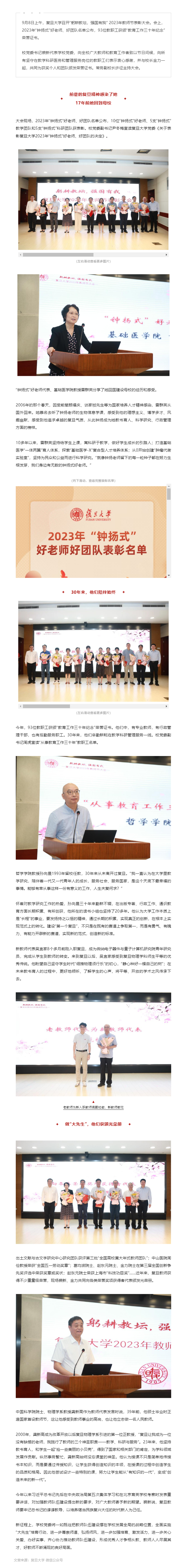 教书育人、陪伴成长,复旦大学召开2023年教师节表彰大会 2023.09.09 摘要:9月8日上午,复旦大学召开“躬耕教坛,强国有我” 2023年教师节表彰大会。会上,2023年“钟扬式”好老师、好团队名单公布,93位教职工获颁“教育工作三十年纪念”荣誉证书。