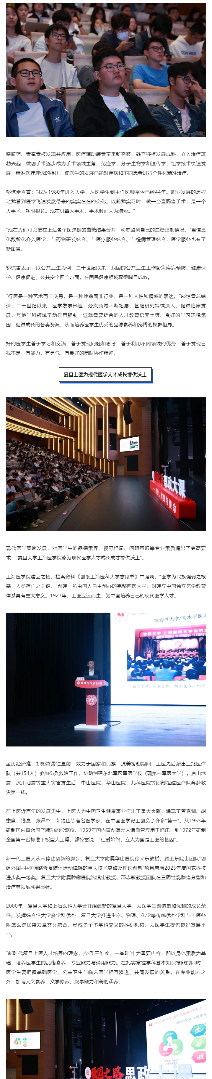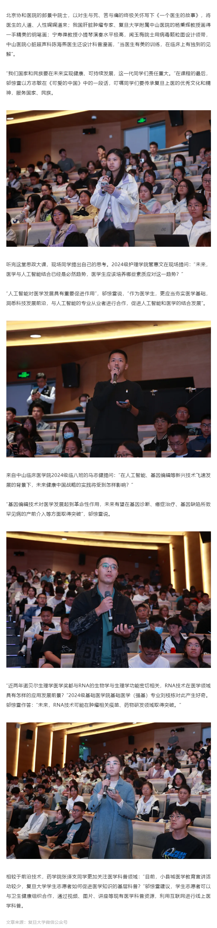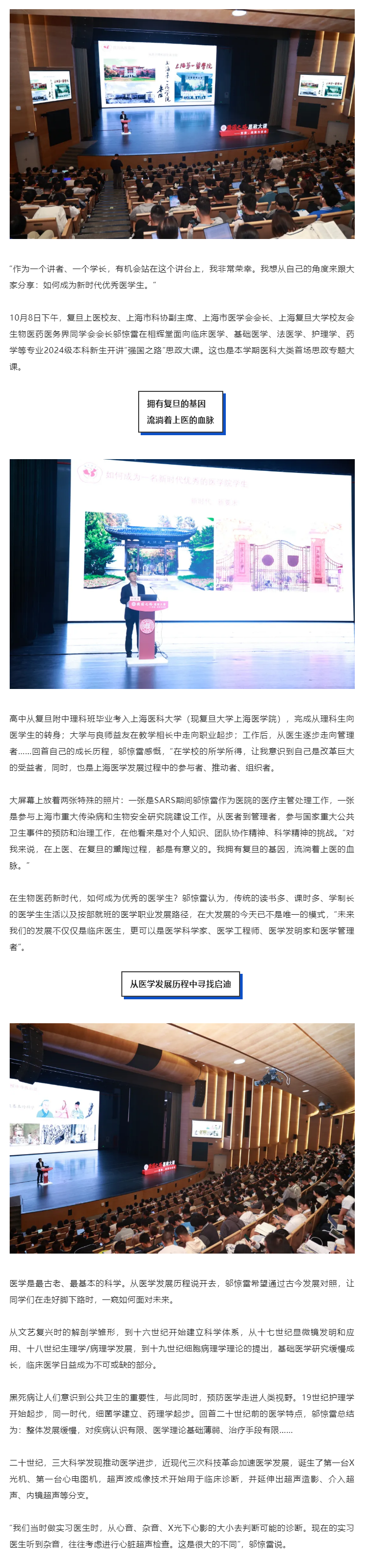 摘要:复旦上医校友、上海市科协副主席、上海市医学会会长、上海复旦大学校友会生物医药医务界同学会会长邬惊雷在相辉堂面向临床医学、基础医学、法医学、护理学、药学等专业2024级本科新生开讲“强国之路”思政大课。
