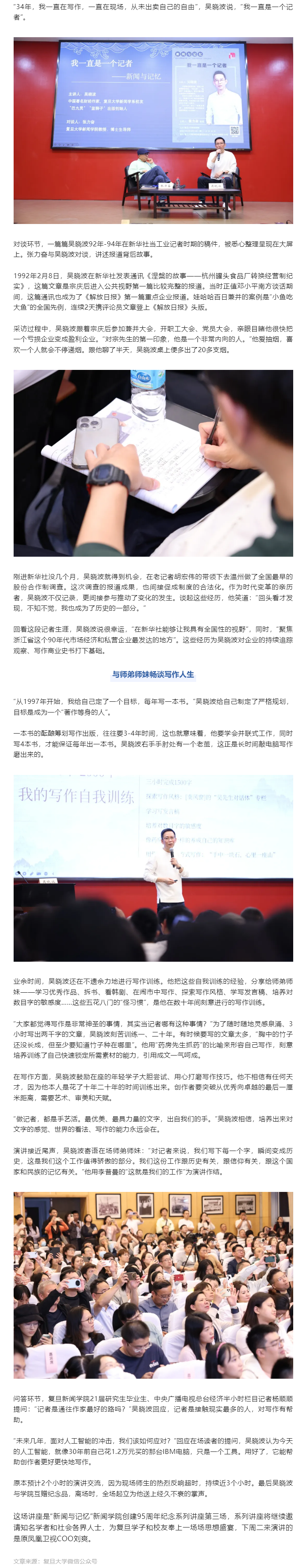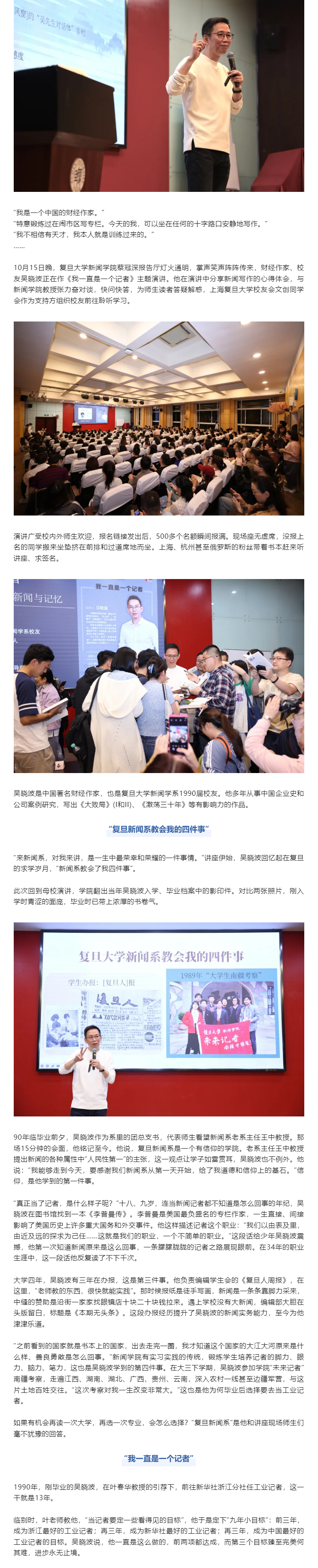 10月15日晚,复旦大学新闻学院蔡冠深报告厅灯火通明,掌声笑声阵阵传来,财经作家、校友吴晓波正在作《我一直是一个记者》主题演讲。