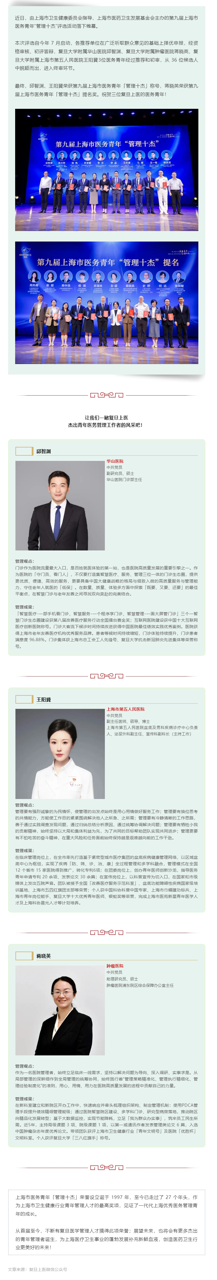 邱智渊、王阳贇荣获第九届上海市医务青年「管理十杰」称号,蒋晓英荣获第九届上海市医务青年「管理十杰」提名奖。