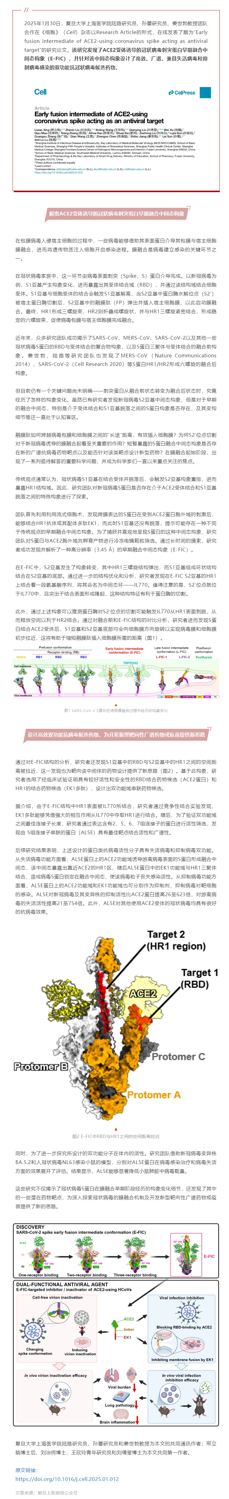 摘要:2025年1月30日,复旦大学上海医学院陆路研究员、孙蕾研究员、姜世勃教授团队合作在《细胞》(Cell)杂志以Research Article的形式,在线发表了题为“Early fusion intermediate of ACE2-using coronavirus spike acting as antiviral target”的研究论文。