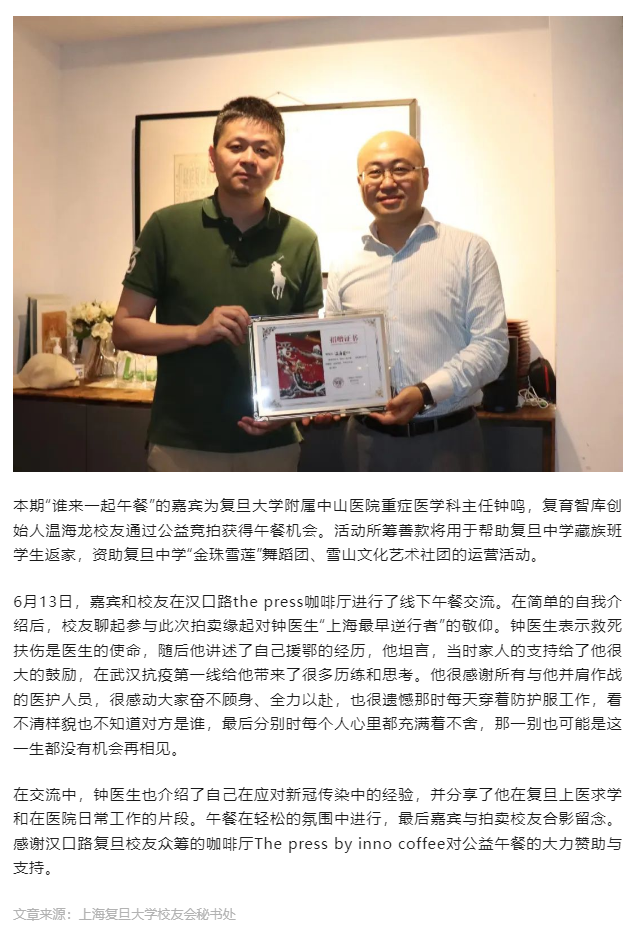 摘要:本期“谁来一起午餐”的嘉宾为复旦大学附属中山医院重症医学科主任钟鸣,复育智库创始人温海龙校友通过公益竞拍获得午餐机会。活动所筹善款将用于帮助复旦中学藏族班学生返家,资助复旦中学“金珠雪莲”舞蹈团、雪山文化艺术社团的运营活动。