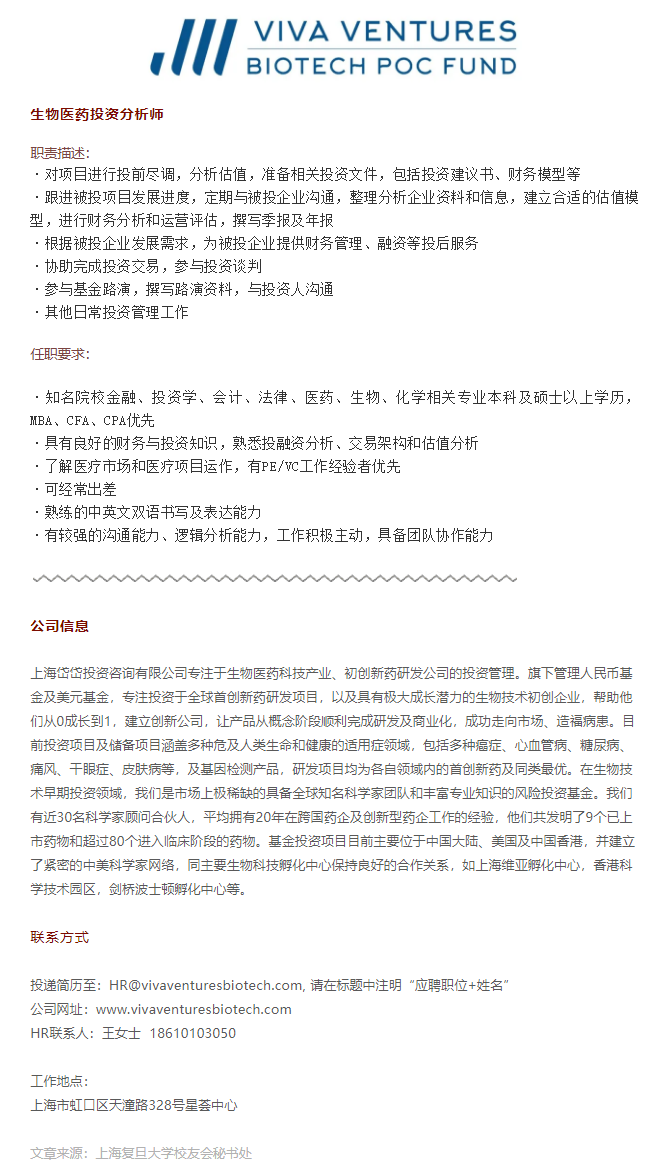 校企招聘|VIVA VENTURES BIOTECH FUND