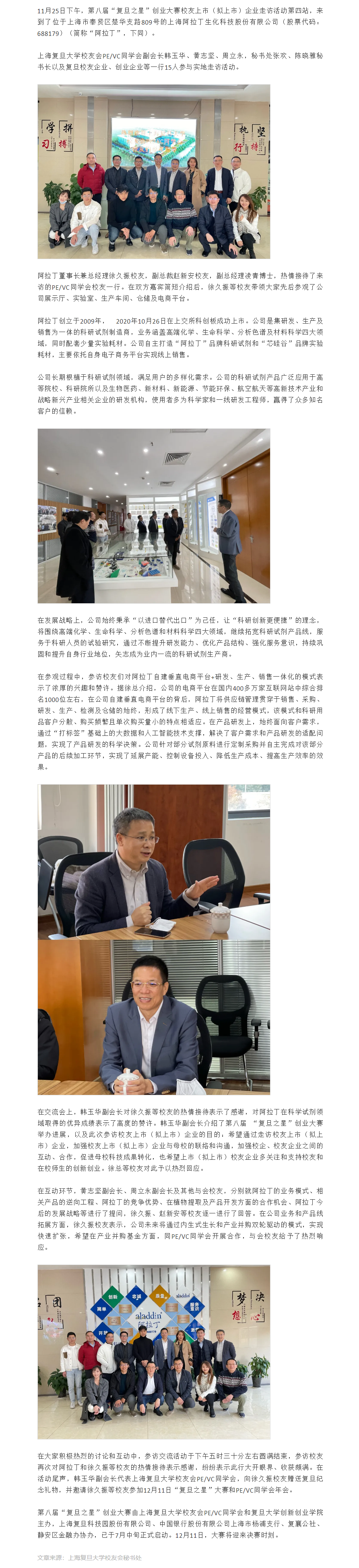 摘要:11月25日下午,第八届“复旦之星”创业大赛校友上市(拟上市)企业走访活动第四站,来到了位于上海市奉贤区楚华支路809号的上海阿拉丁生化科技股份有限公司(股票代码:688179)(简称“阿拉丁”,下同)。上海复旦大学校友会PE/VC同学会副会长韩玉华、黄志坚、周立永,秘书处张欢、陈晓雅秘书长以及复旦校友企业、创业企业等一行15人参与实地走访活动。