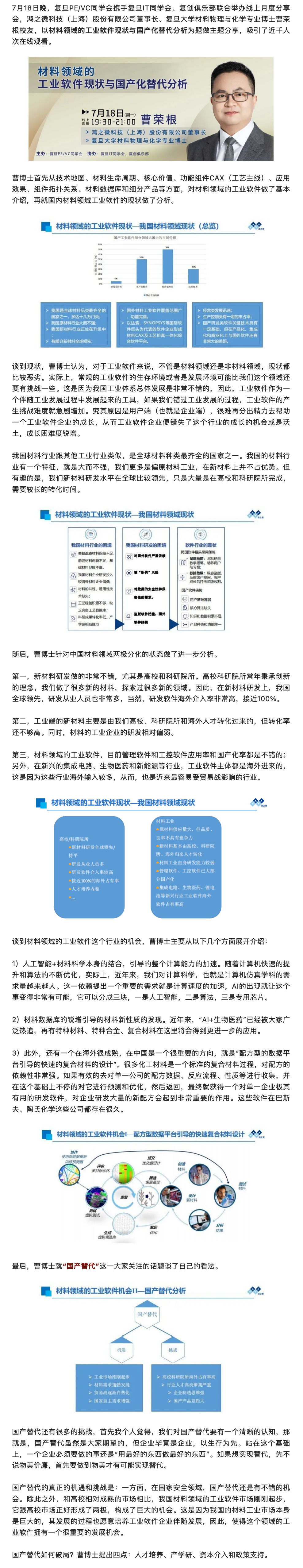 摘要:7月18日晚,复旦PE/VC同学会携手复旦IT同学会、复创俱乐部联合举办线上月度分享会,鸿之微科技(上海)股份有限公司董事长、复旦大学材料物理与化学专业博士曹荣根校友,以材料领域的工业软件现状与国产化替代分析为题做主题分享,吸引了近千人次在线观看。
