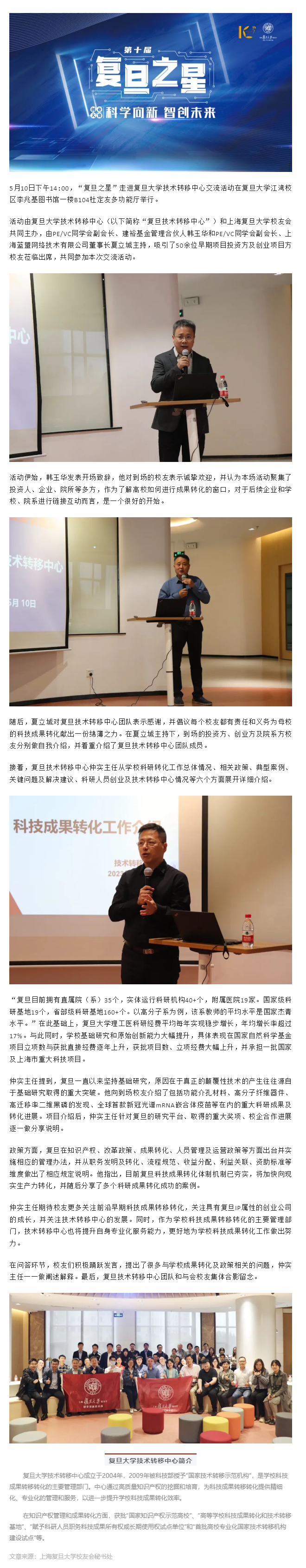 新闻 | “复旦之星”走进复旦大学技术转移中心 探讨学校科研成果转化 2023.05.13 摘要:5月10日下午14:00,“复旦之星”走进复旦大学技术转移中心交流活动在复旦大学江湾校区李兆基图书馆一楼B104杜定友多功能厅举行。