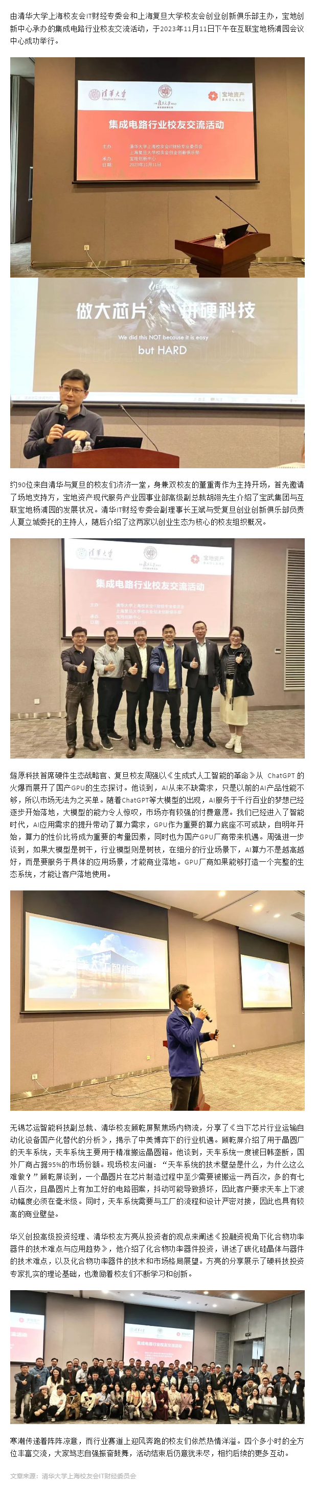 简讯 | 集成电路行业校友交流活动圆满举办 2023.11.22 摘要:由清华大学上海校友会IT财经专委会和上海复旦大学校友会创业创新俱乐部主办,宝地创新中心承办的集成电路行业校友交流活动,于2023年11月11日下午在互联宝地杨浦园会议中心成功举行。